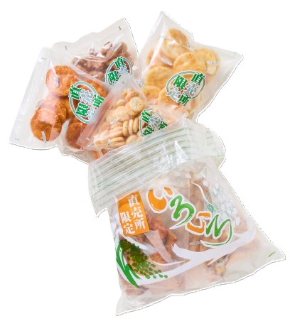 工場直送のあられ・おせんべいをその場で袋詰め。定番商品を日替わりで提供(平日限定 10時頃〜 / 13時頃〜)。