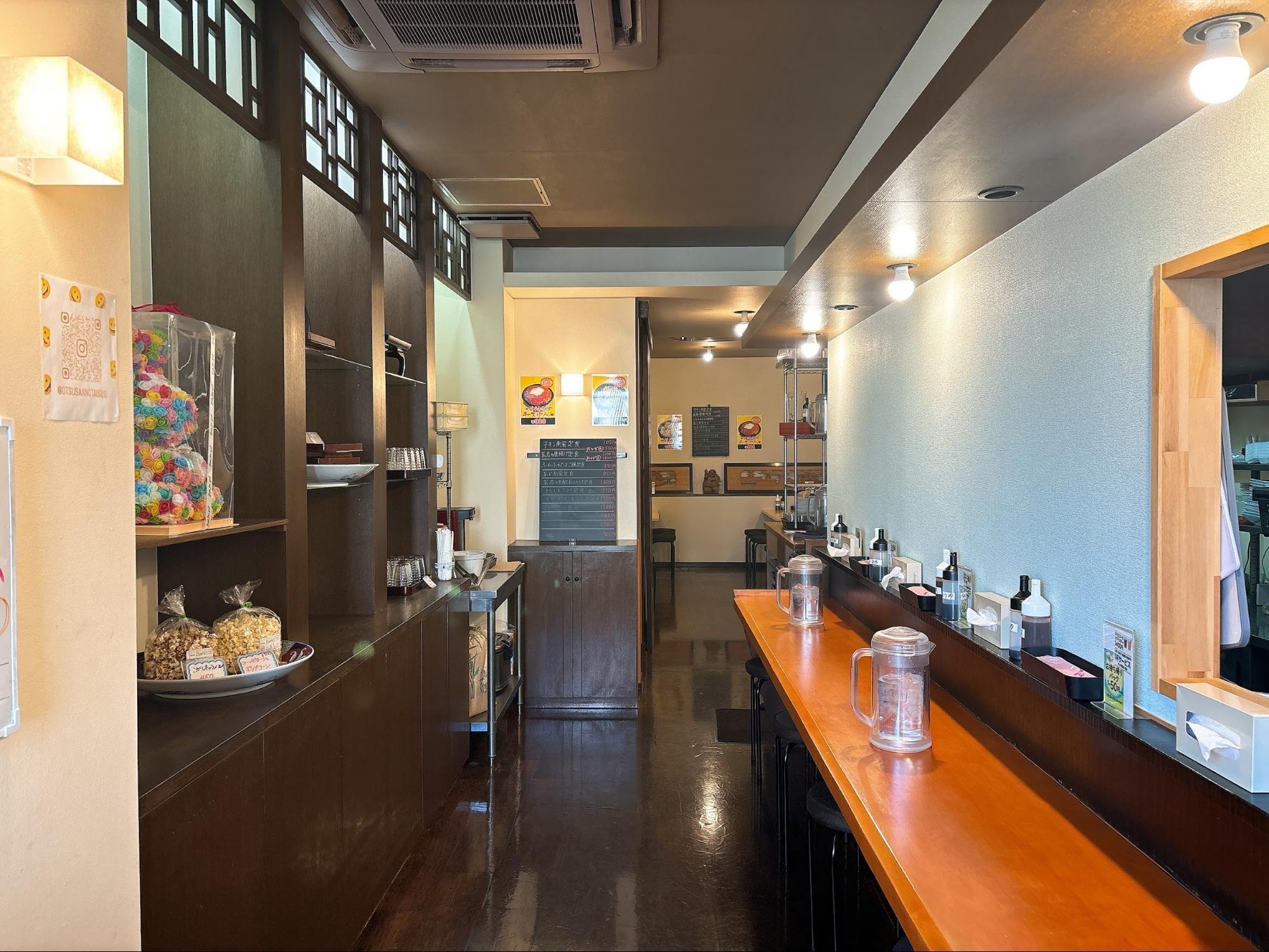 奥にはカウンター席とテーブル席があり、店内で定食も楽しめます。