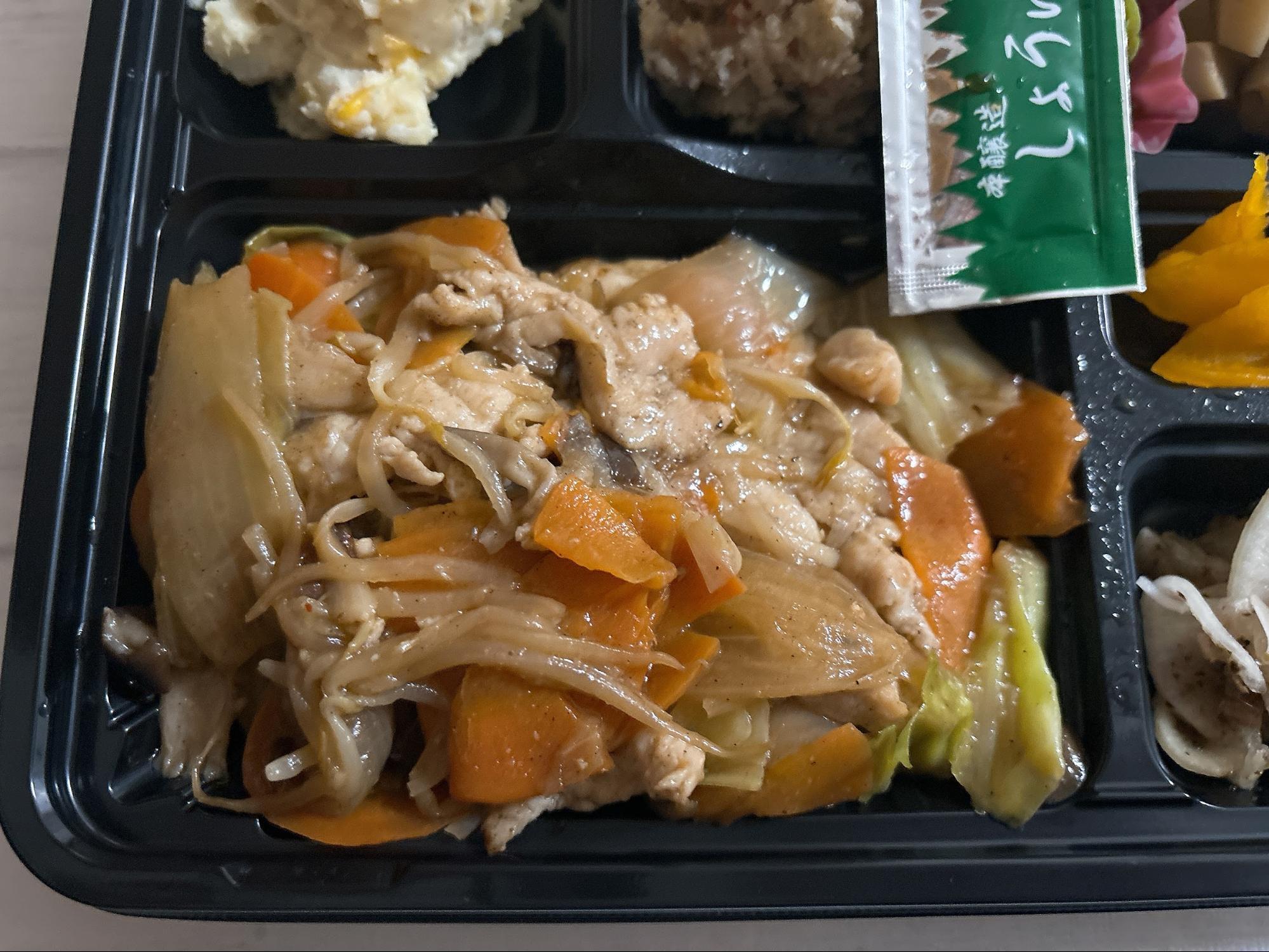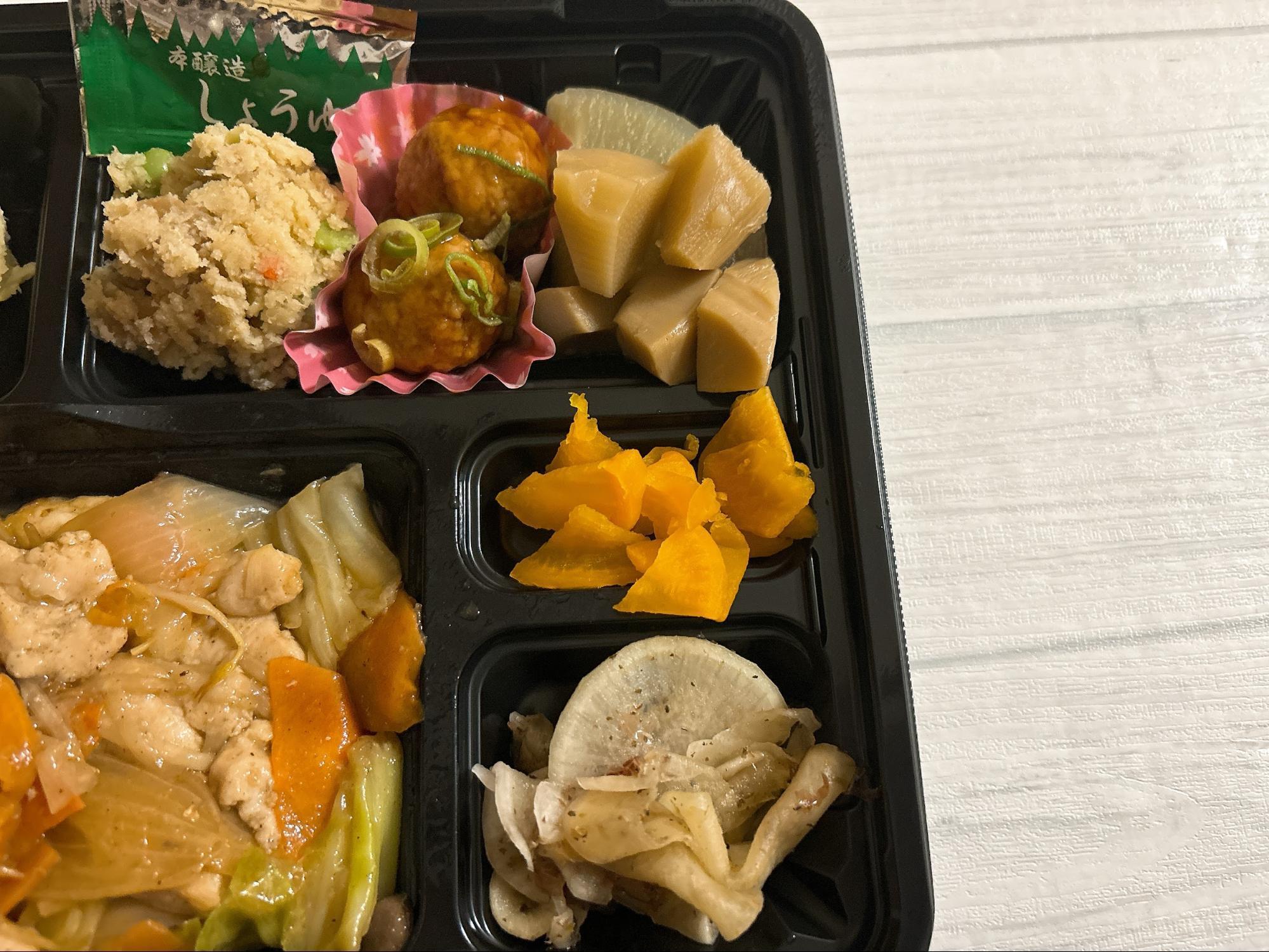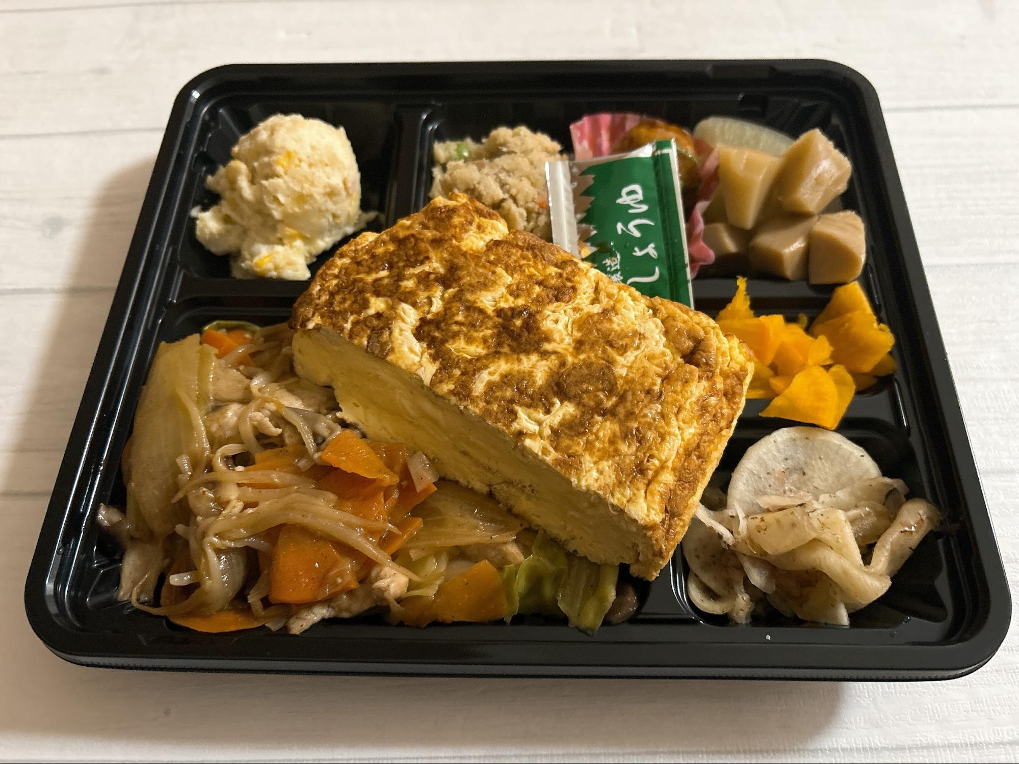 さらに副菜も充実していて、ポテトサラダ、煮物なども入っていて、ボリューム満点です。