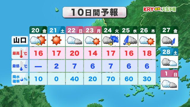 週末からの3連休は、南風が流れ込んで一段と気温上昇。日曜日は最高気温が20度に達する可能性もあります。一方、その日曜日は気圧の谷の通過で雲が増え、一部にわか雨も。また、一時的に黄砂飛来の可能性もあります。3連休中は雨は降っても量はごくわずかですが、連休明けの火曜日は久々に本降り…少々まとまった雨になるでしょう。