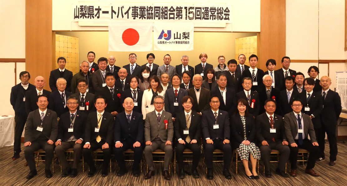 今総会では来賓として多数の関係組織や団体の担当者ら列席し、祝辞のことばを述べている。あいさつに立ったのはAJ大村・会長、山梨県警察本部交通部の田村和卓哉・参事官、同警察本部生活安全部の所紀久男・参事官、関東運輸局山梨運輸支局の市川尚紀・首席陸運技術専門官、山梨県交通安全協会の佐藤隆・推進センター長、山梨県二輪車普及安全協会の塚原重一・会長、山梨県中小企業団体中央会の堀内修・事務局次長の7人。各々担当分野での県内の状況や取り組みについて述べると同時に、組合員らに活動への協力やエールを送ることばを述べている。