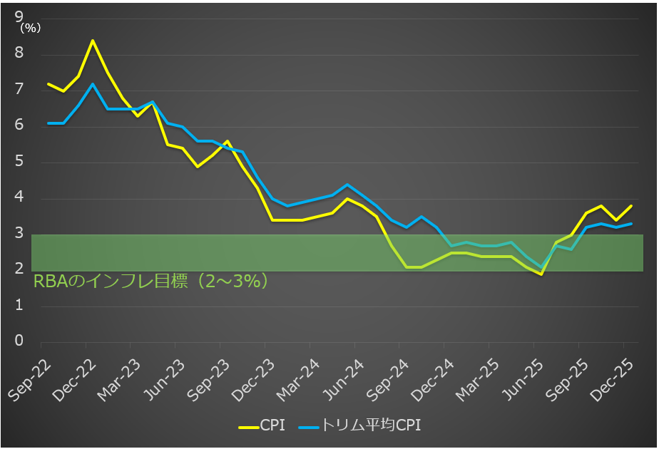 来週は25日に豪1月消費者物価指数が発表されます。前回12月分は前年比+3.8%、コアCPIにあたるCPIトリム平均は前年比+3.3%でともに前月(+3.4%、+3.2%)から伸びが加速していました。RBAは2月の金融政策報告で2026年6月時点でのCPIは+4.2%、CPIトリム平均は+3.7%と予想しており、現時点ではRBAの予測よりもインフレは低い状態です。もっとも労働市場が予想以上の強さを見せる中で、インフレ率も加速していれば、現在約13%程度の織り込みにとどまっている3月のRBA理事会での追加利上げ観測が急速に高まる可能性があります。