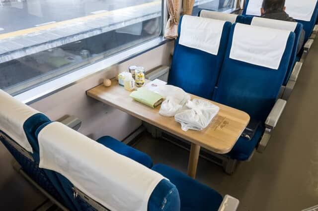 客車は3両で、真ん中の12系車両は1969年に製造され夜行列車などで活躍。その前後にぶどう色の14系車両を連結しています。今回のグルメ号では座席を向い合わせにしてテーブルを設置。窓のカーテンには懐かしさを感じます。