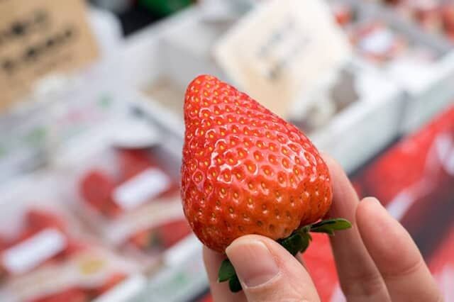 駅の外では、ツアー特典として出会いの森いちご園と、だいもんいちご園のいちごを、それぞれ1粒づつ試食できます。大粒で甘い「とちあいか」と、甘さと酸味をしっかり楽しめる「とちおとめ」の食べくらべができるのもレア体験です。
