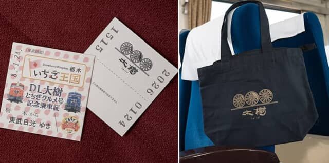 「いちご王国」プロモーションとのコラボレーション記念乗車証や、SL大樹のロゴをプリントしたイベント限定のトートバッグは、マニアならずとも嬉しいですね。