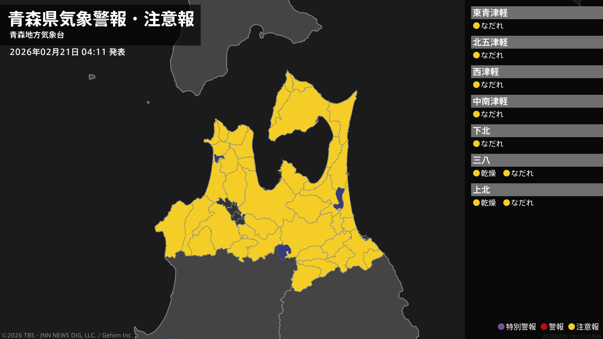 【なだれ注意報】青森県・青森市、弘前市、八戸市、黒石市、五所川原市、十和田市などに発表(雪崩注意報) 21日04:11時点