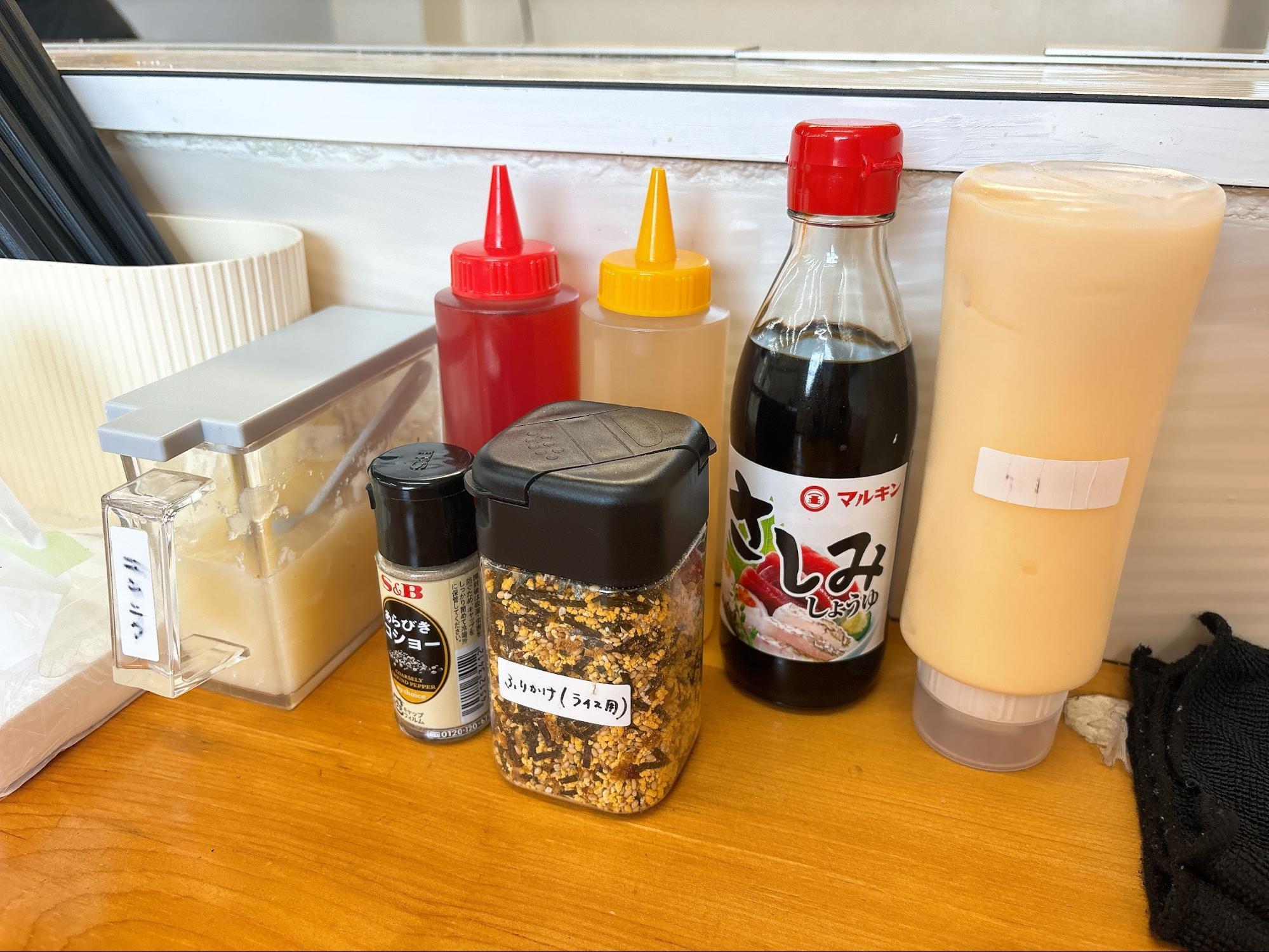 テーブルの上には、ラー油や酢、ニンニクなどの調味料が置いてあります。