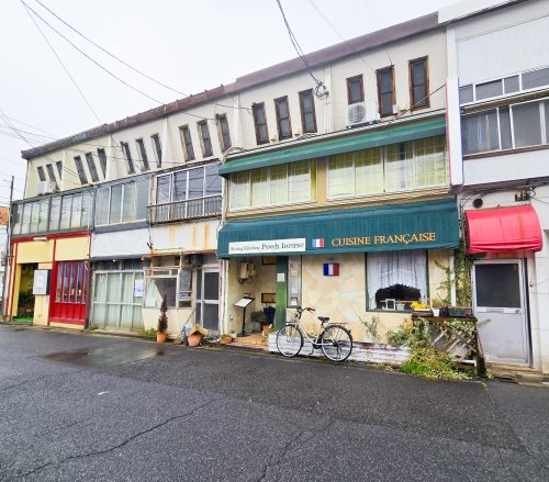 外国風の外観が目を引くお店で、緑色のひさしが目印。どこか異国を感じさせる佇まいです。