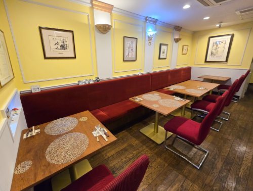 クリーム色を基調とした店内は、ヨーロッパ調のインテリア。壁には額装された絵画が飾られています。