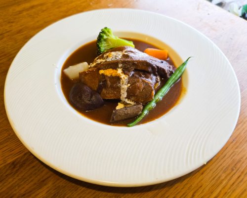たっぷりとかかったデミグラスソースの中に、驚くほどやわらかく煮込まれたタン。