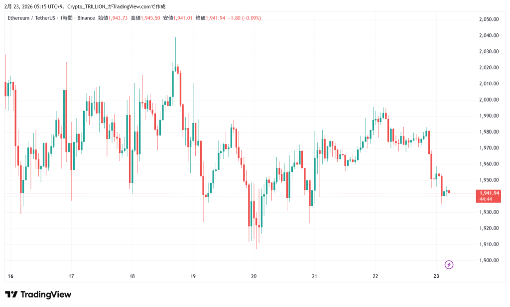 23日5時現在のイーサリアムの価格は1,943.73USDT、前日同時刻比で-2.2%の下落となっている。
