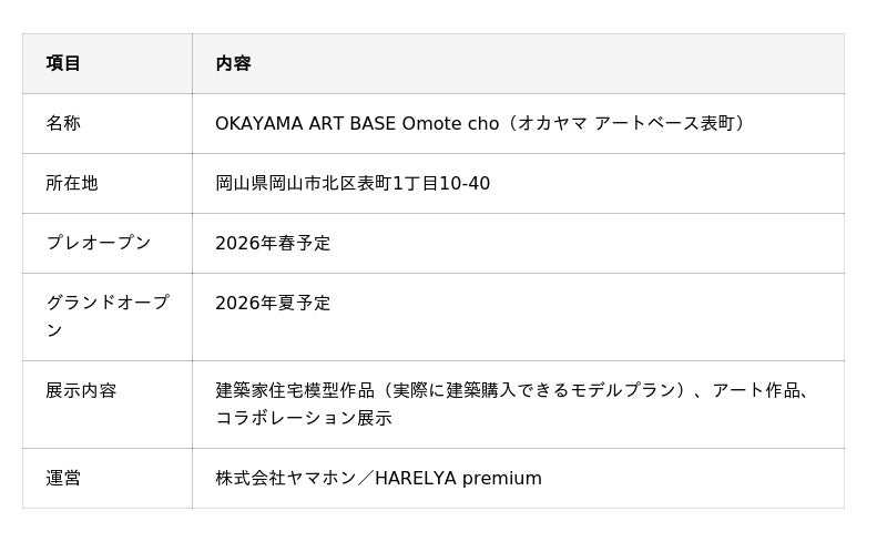 株式会社ヤマホン(本社:岡山県玉野市田井3丁目20番28号、代表取締役:山本 佳彦)は、 アートと建築を融合した総合展示空間 「OKAYAMA ART BASE Omote cho(オカヤマ アートベース表町)」 を 2026年夏にグランドオープン、2026年春にプレオープンする運びとなりました。