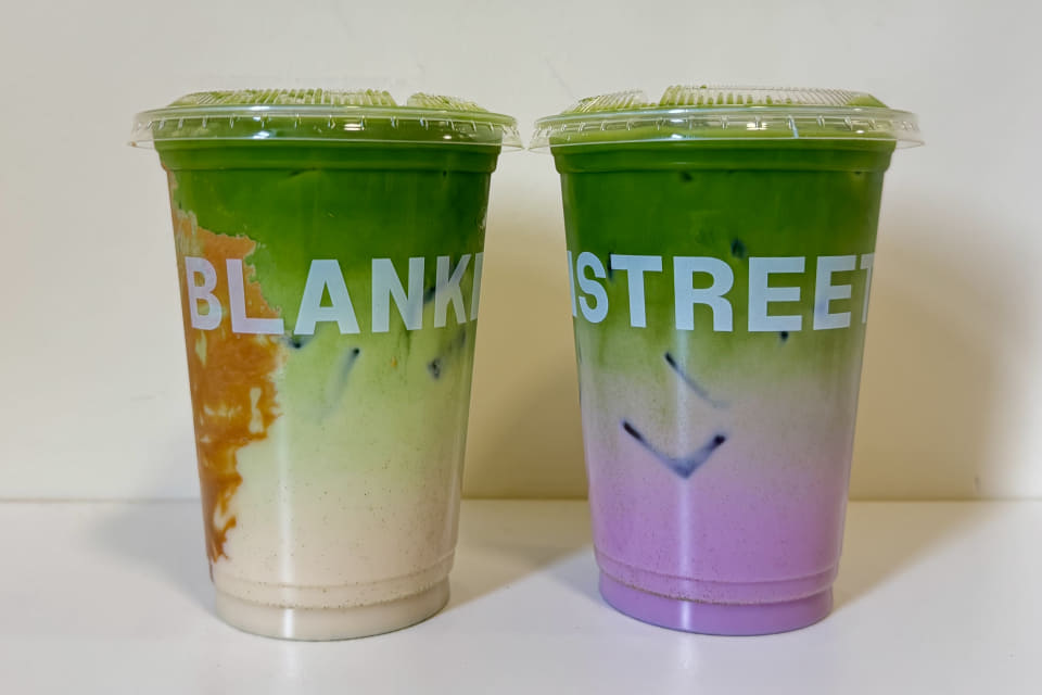1つ目の抹茶ラテのフレーバーはブルーベリー。そのほか、バニラとウベが入っており、鮮やかな緑と紫のコントラストが特徴の一杯です。抹茶×バニラはほかのカフェでも定番で、Blank Streetでは6つの抹茶ラテフレーバーのうち5つに使用されています。