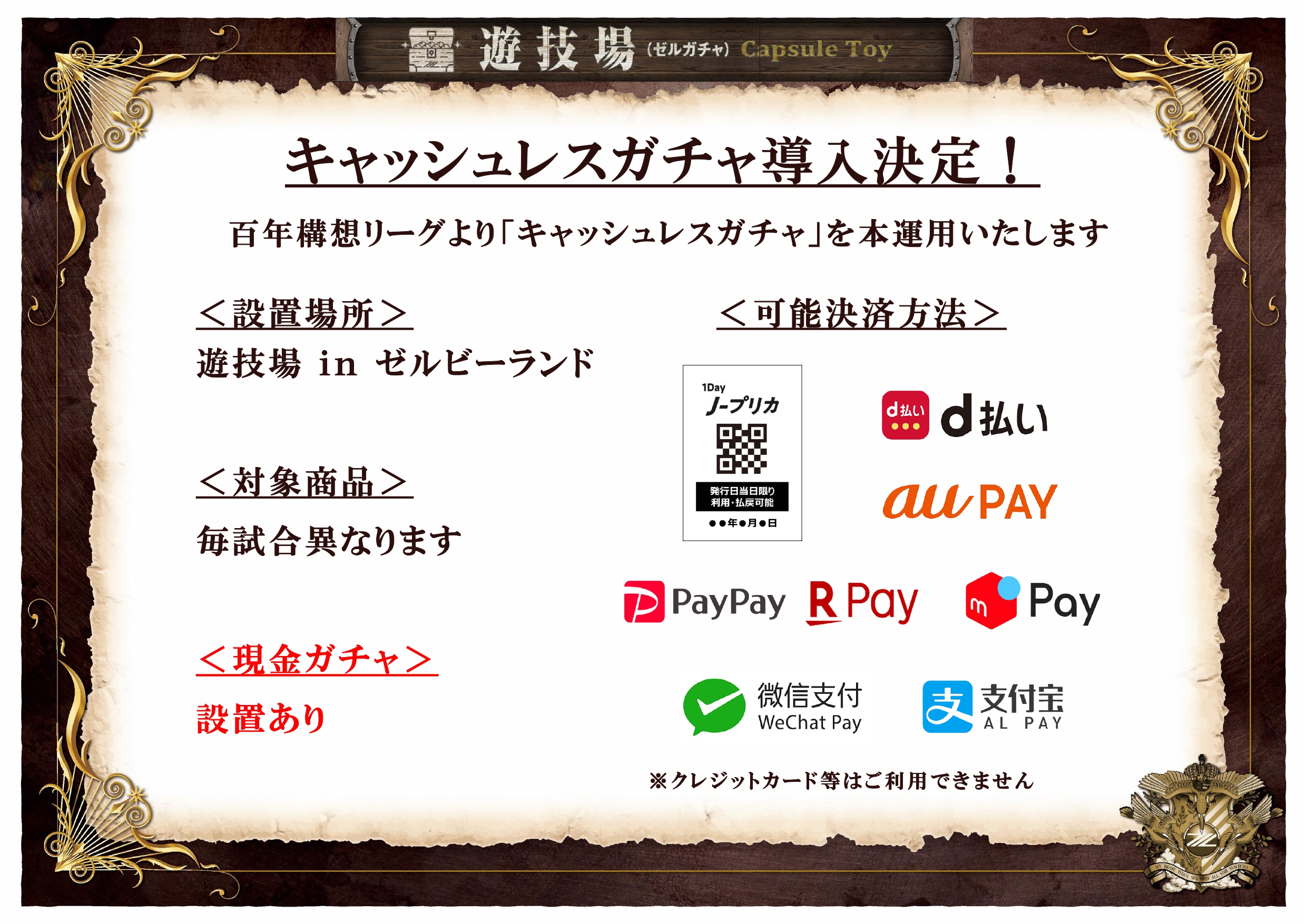 ※遊技場inゼルビーランドは、「現金専用ガチャ」「キャッシュレスガチャ」を併用して販売いたします。