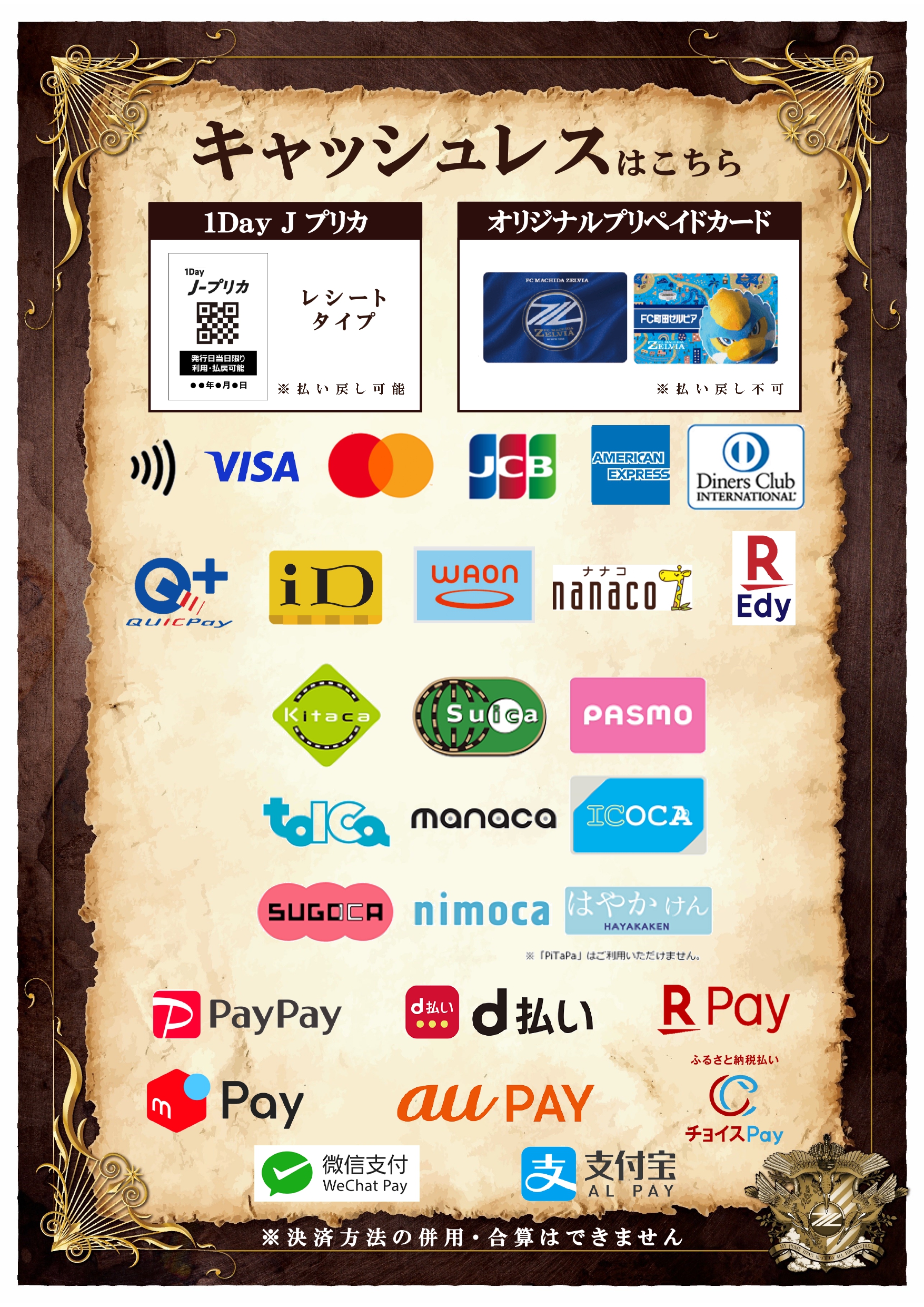 FC町田ゼルビアのホームゲーム(国立開催試合含む)では、総合案内所Ⅰ/武器・防具屋(グッズ売店)のお支払いにおきまして、キャッシュレス決済のみのご利用とさせていただきます。