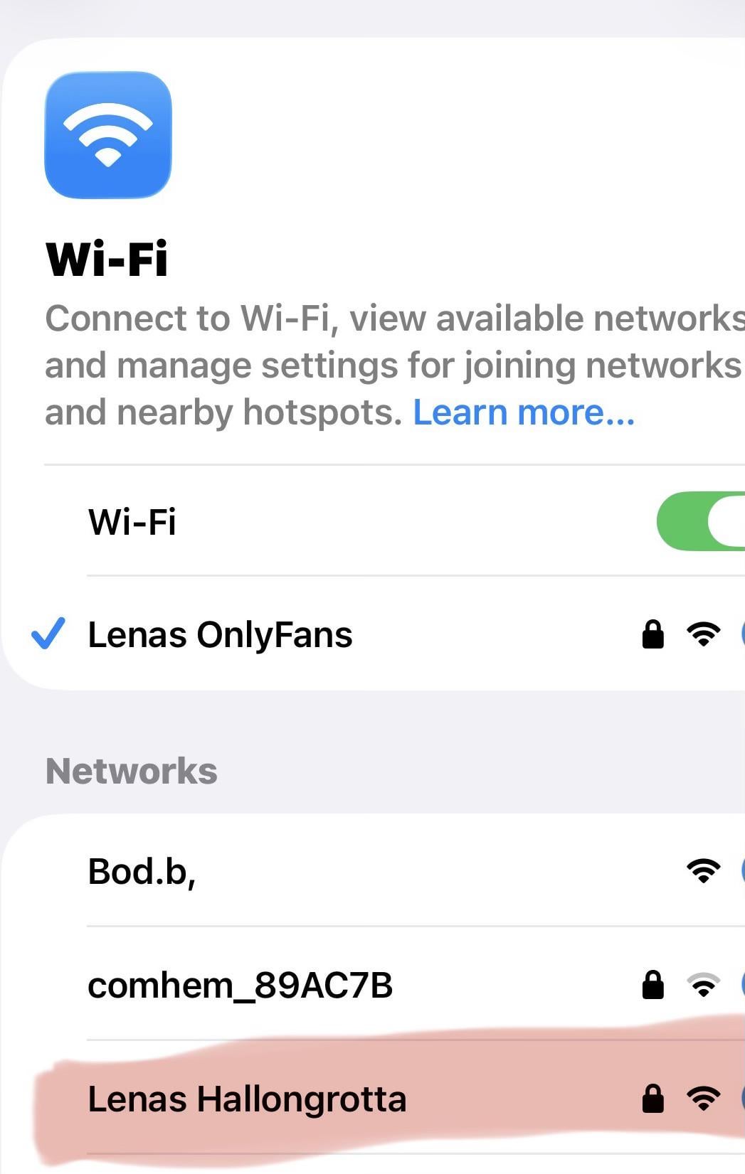 近所の人が接続して、Wi-Fi の名前を Lena’s Hallongrotta に変更しました。私はとても満足しています。