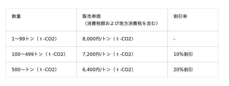 購入数量に応じた割引制度を設けており、500t-CO2以上の購入では、最大20%の割引価格で提供します。