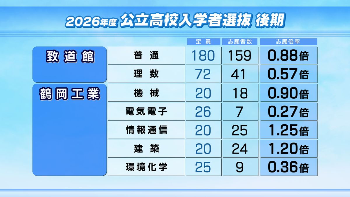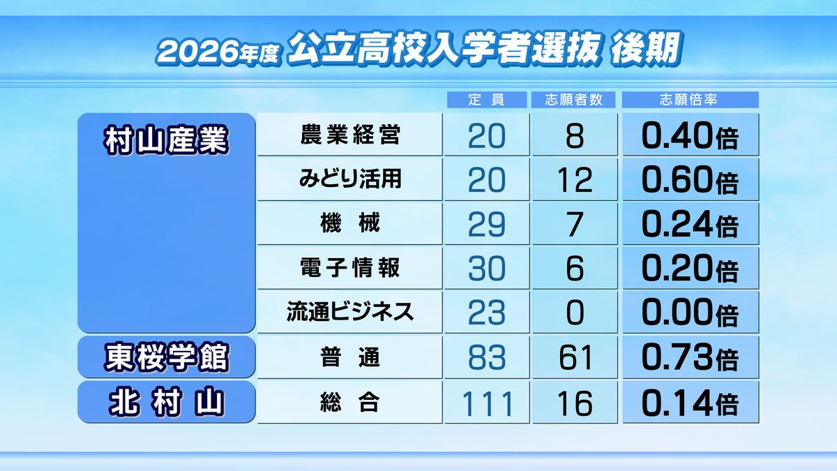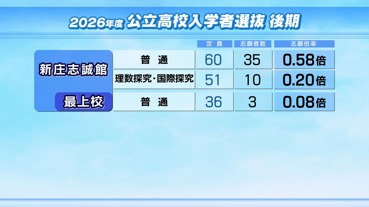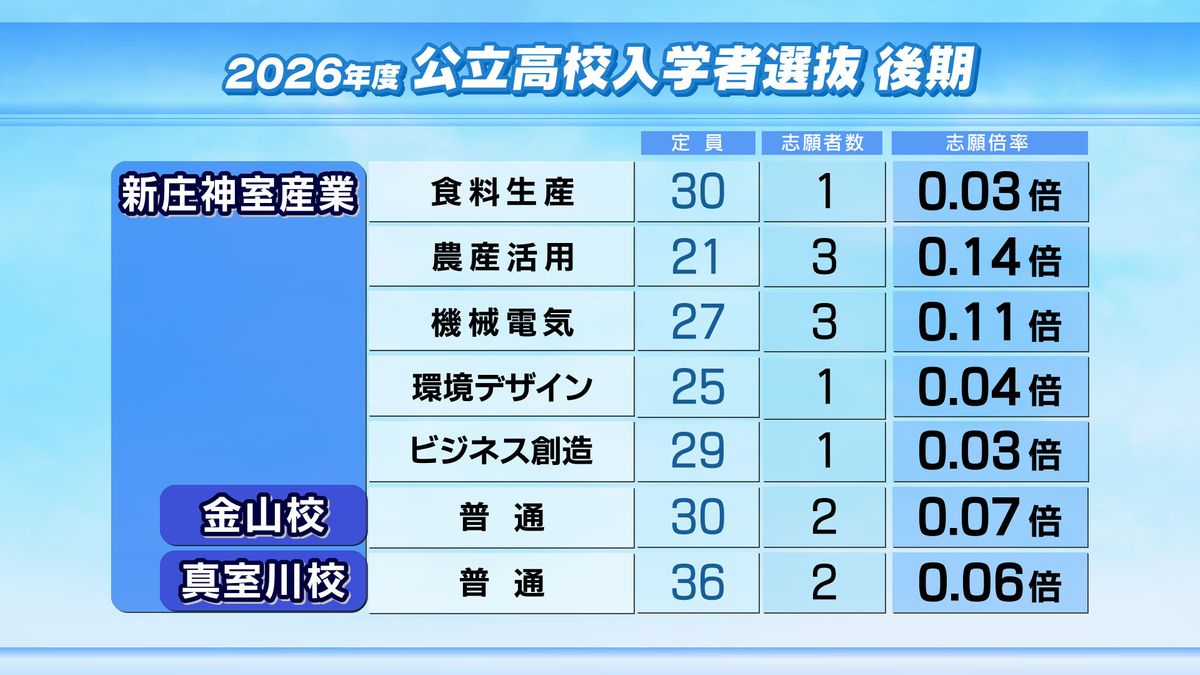 ことし4月に開校する新庄志誠館は普通科が0.58倍、探究科が0.2倍といずれも定員割れです。最上校も定員割れです。