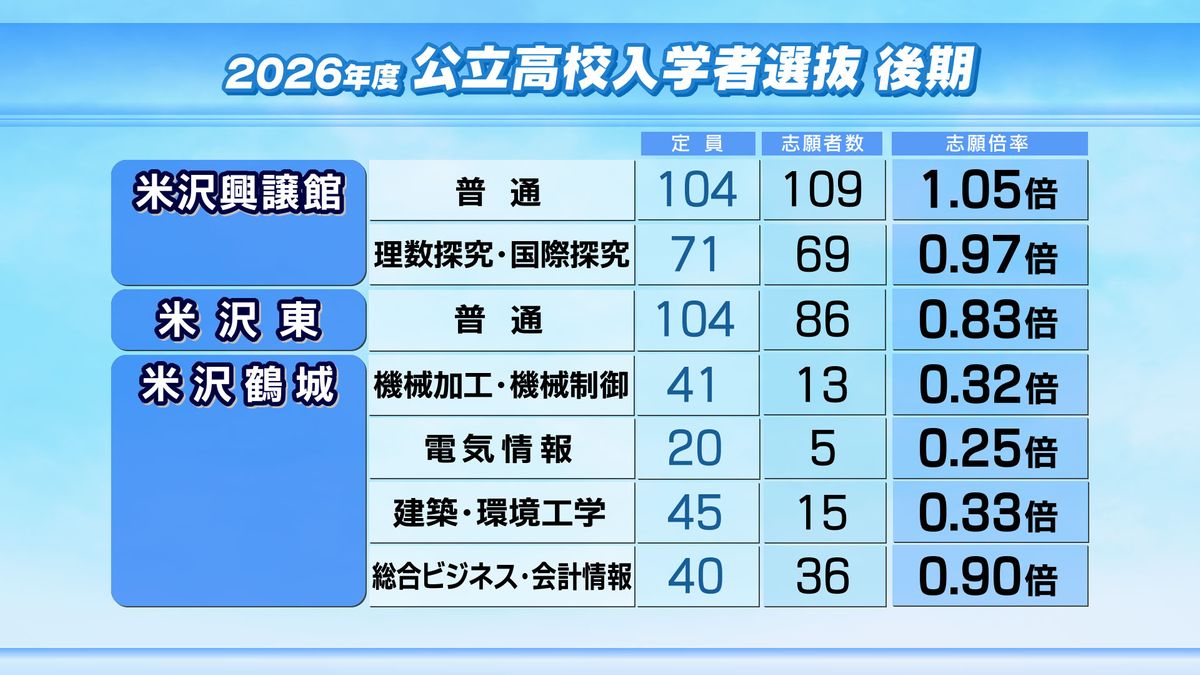 米沢興譲館の普通科は1.05倍、探究科は定員割れでした。