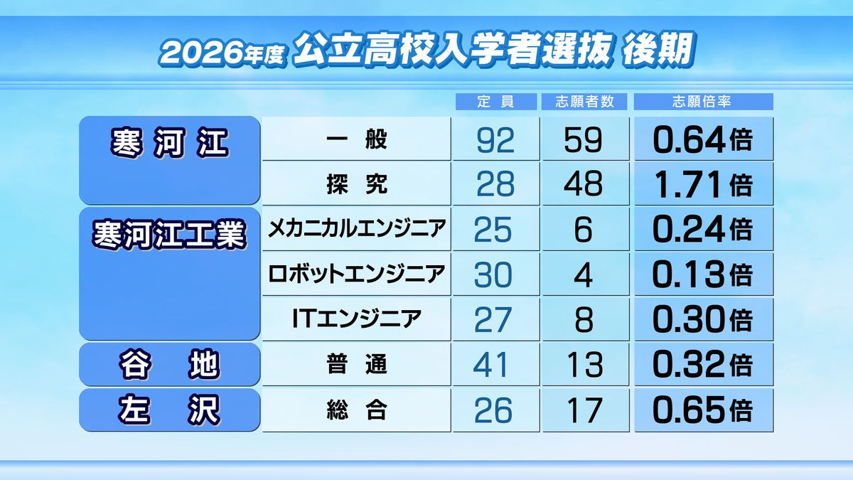 寒河江の普通科探究コースは1.71倍で、全日制で2番目に高くなりました。一般コースは定員割れでした。