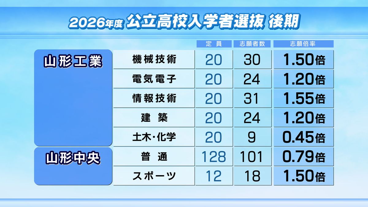 2026年の山形県内公立高校の後期入試の志願倍率について、公表されたすべての高校の状況をお伝えします。
