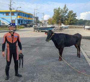 宮古島海上保安部に所属する男性潜水士が23日朝、沖縄県宮古島市の海で泳いでいた牛を救助した。潜水士は泳ぎながら牛の鼻につながれていたロープを引っ張り、スロープから地上に引き揚げた。牛にけがはなかったという。宮古島海保が24日発表した。