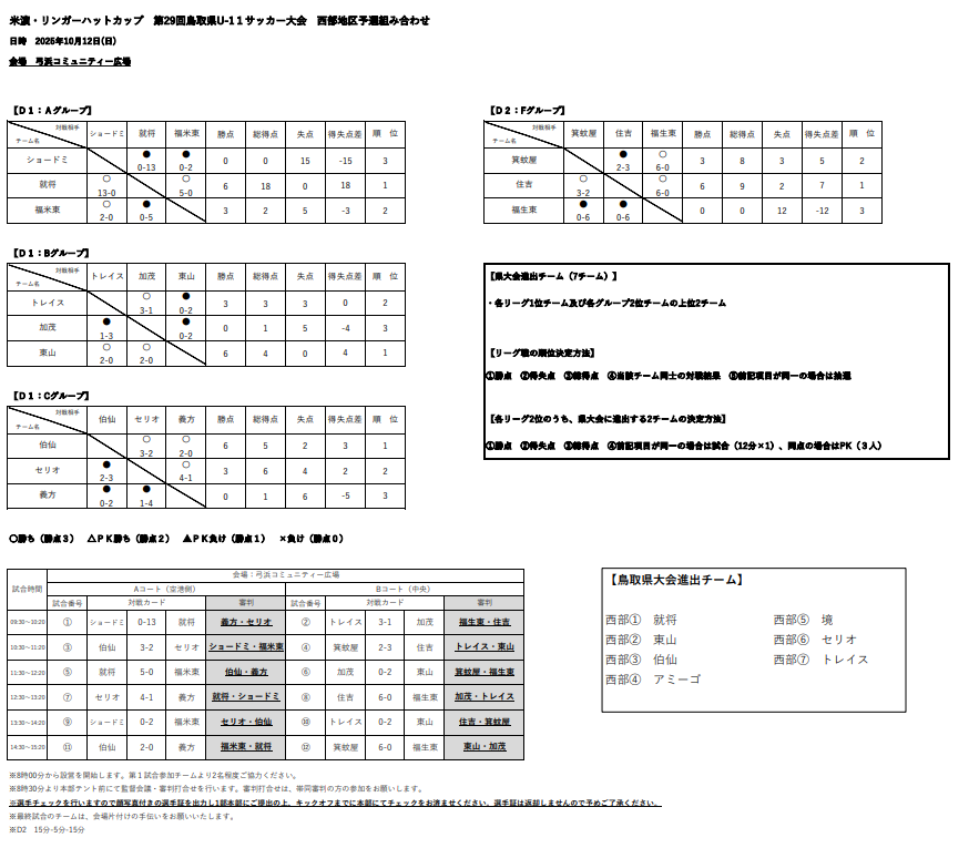 上位2チームは、2026年4月4日(土)から5日(日)に山口県で開催される「JA全農杯チビリンピック2026小学生8人制サッカーin中国兼第24回中国ユースサッカーU-12ジョイフル大会」の鳥取県代表チームとして推薦する。