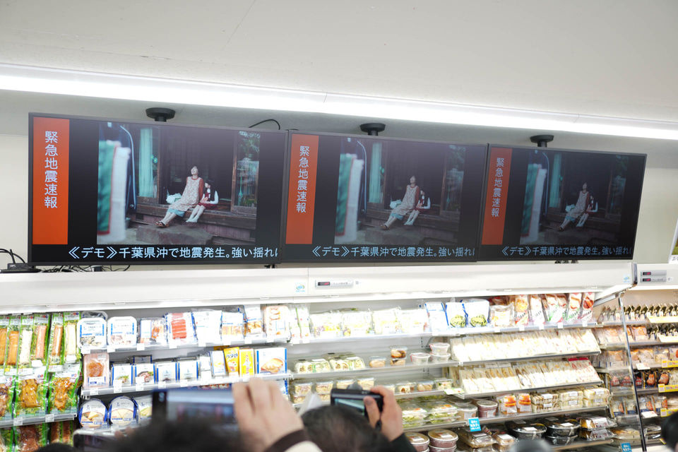 変わったところでは、店内の冷蔵ケースの上にサイネージディスプレイが天吊りされており、そこには普段はプロモーション映像などが流れているが、緊急地震速報が発報された際には、警報音とともに速報内容を表示する機能も備えている。この緊急速報は店舗スタッフが使用する業務用タブレットにも表示される。