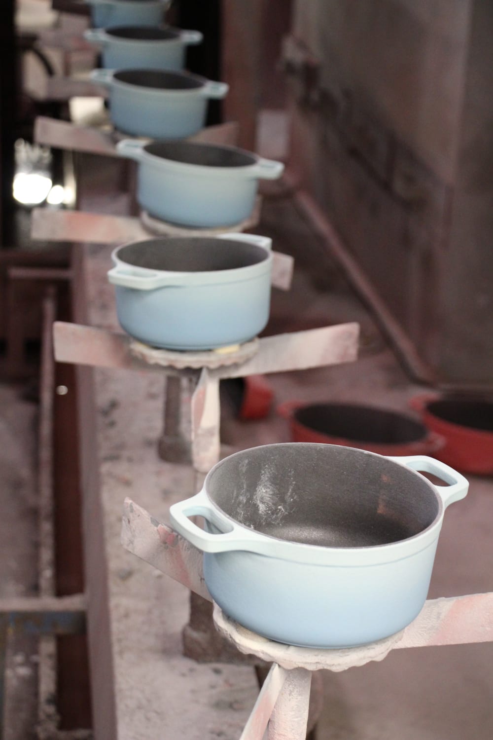 製造工程は、鋳鉄製品の鋳造と、それに続くホーロー加工がメイン。ホーロー加工によって、製品に美しい濃淡や濃淡の色合いが生まれます。伝統的な手法で手作業で行われることで、厳しい商品チェックを受け、美しい単色や奥行きのあるグラデーションが生まれるのです。職人の経験と技、そして妥協のない工程の積み重ねによってようやく完成するという「クラフトマンシップ」を大切にしつづけてきたブランドなのです。