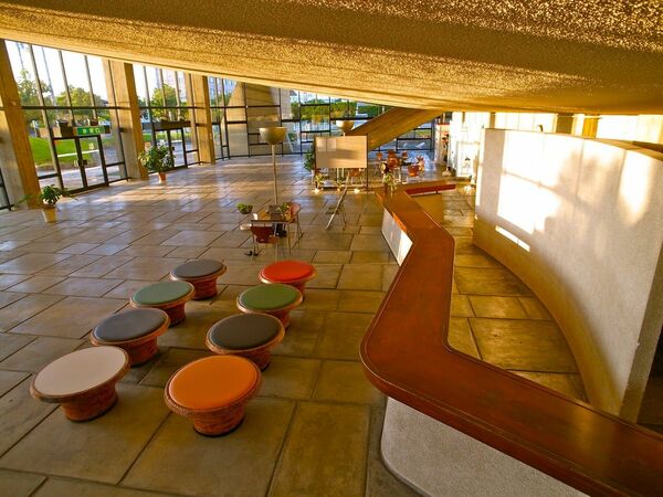 旧香川県立体育館内部。家具デザインは「香川県庁舎東館」と同じく剣持勇が手掛けた。県庁舎では家具も建築の附属物として重要文化財に指定されている