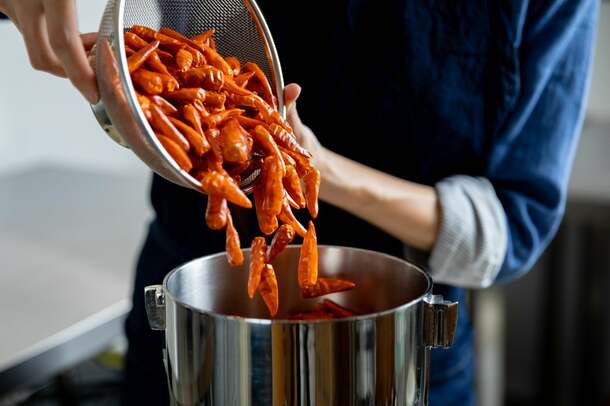 滋賀県南部に位置する湖南市の下田地区。「弥平とうがらし」は、この地域に100年以上前から伝わる伝統野菜です。その特長は、鮮やかなオレンジ色の見た目と、タカノツメの2倍という刺激的な辛さ。それでいて甘さや旨み、芳醇な香りを持つという唯一無二の唐辛子です。