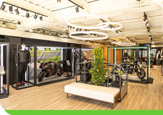 五感で感じるプレミアムな空間 ショールームには、独自の香りと音楽が広がり、リラックスして愛車選びができる空間を演出。最新のカワサキモーターサイクル(Ninja, Z, Wシリーズ等)をゆっくりとご覧いただけます。