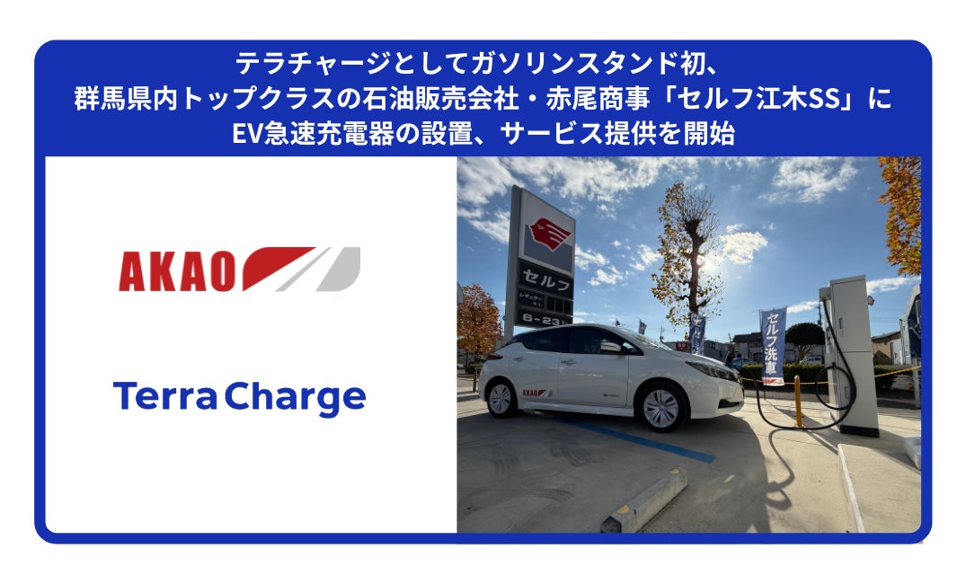 EV(電気自動車)向け充電サービス「Terra Charge(テラチャージ)」を展開するTerra Charge 株式会社(本社:東京都港区、代表取締役社長:徳重徹、以下「当社」)は、ガソリンスタンドへの設置としては初めて※、群馬県内トップクラスの石油販売会社で、クリーン電気の販売等を推進する赤尾商事株式会社(本社:群馬県高崎市、代表取締役社長:赤尾佳子)が運営する、群馬県高崎市のガソリンスタンド「セルフ江木SS」にEV急速充電器の設置を完了し、EV充電サービスの提供を開始したことをお知らせいたします。