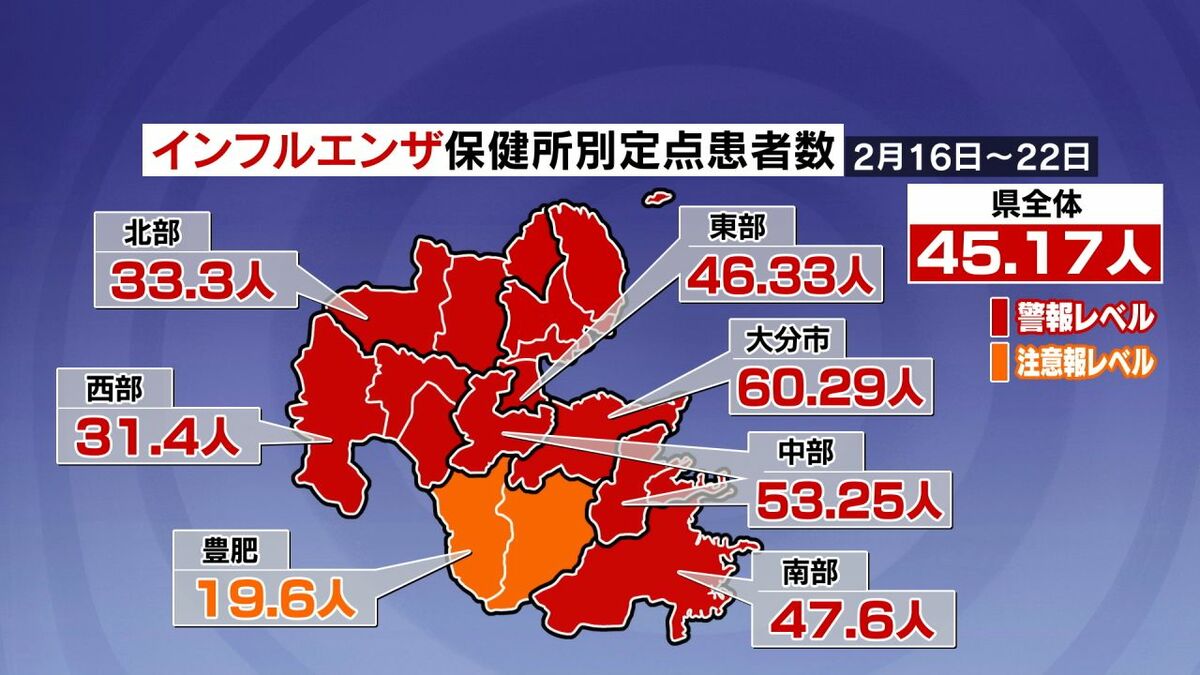大分県内のインフルエンザ患者数は2週連続で減少したものの、依然警報水準を上回っています。