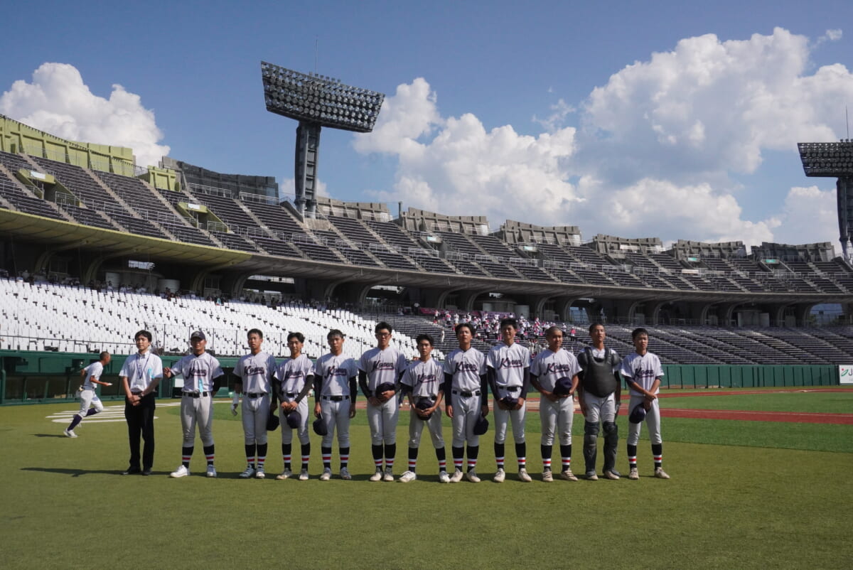↓ 唯一の2年生小阪主将の話を聞く長野高専ナイン