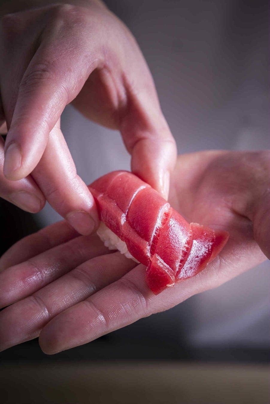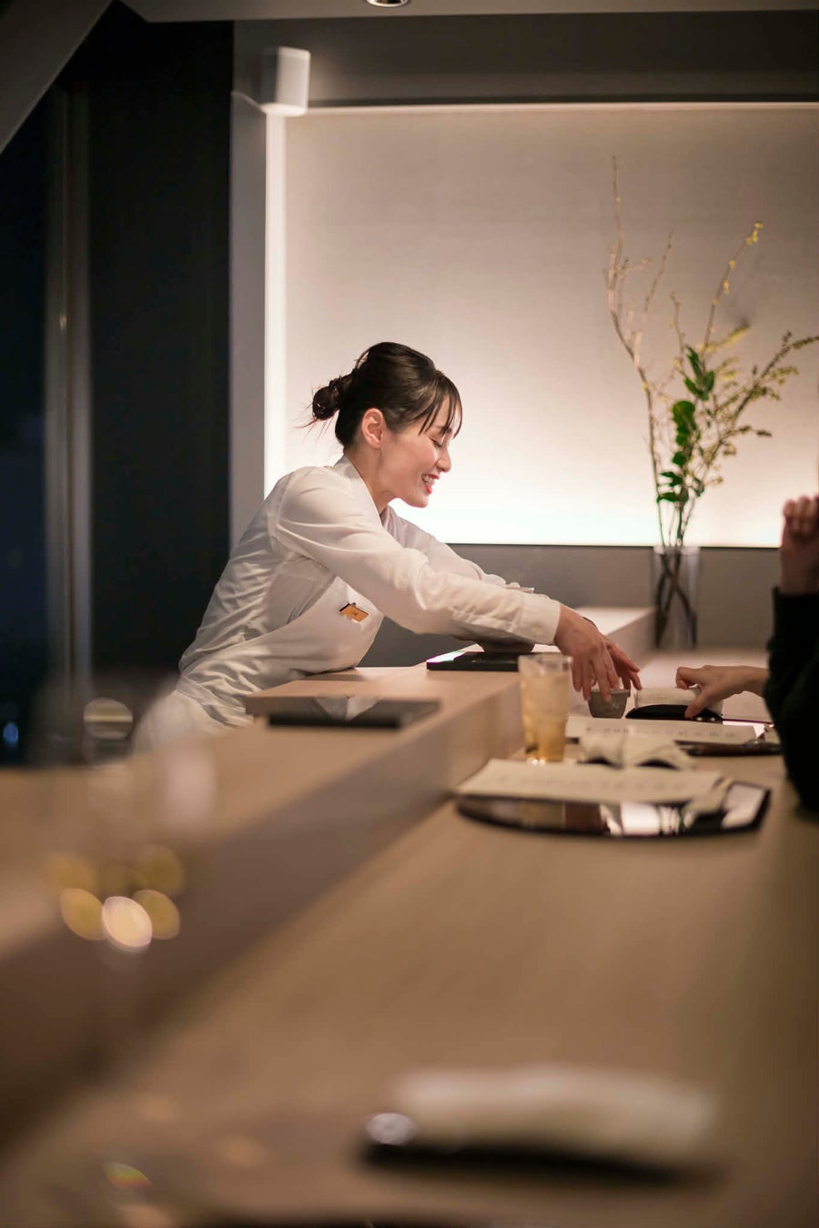 店内は、商業施設内の飲食店としては驚きの広々とした空間使いで、6階からの眺望も特徴的です。白木がもたらすやわらかな質感と影の落ち着きを大切にしております。席間にはゆとりを持たせ、空間に“余白”を残すことで、お食事のひとときをより快適にお過ごしいただけます。また、窓越しには大きくL字のカウンターを配し、職人によるライブ感あふれるパフォーマンスを目の前でお楽しみいただけます。