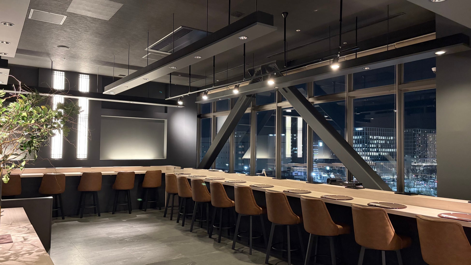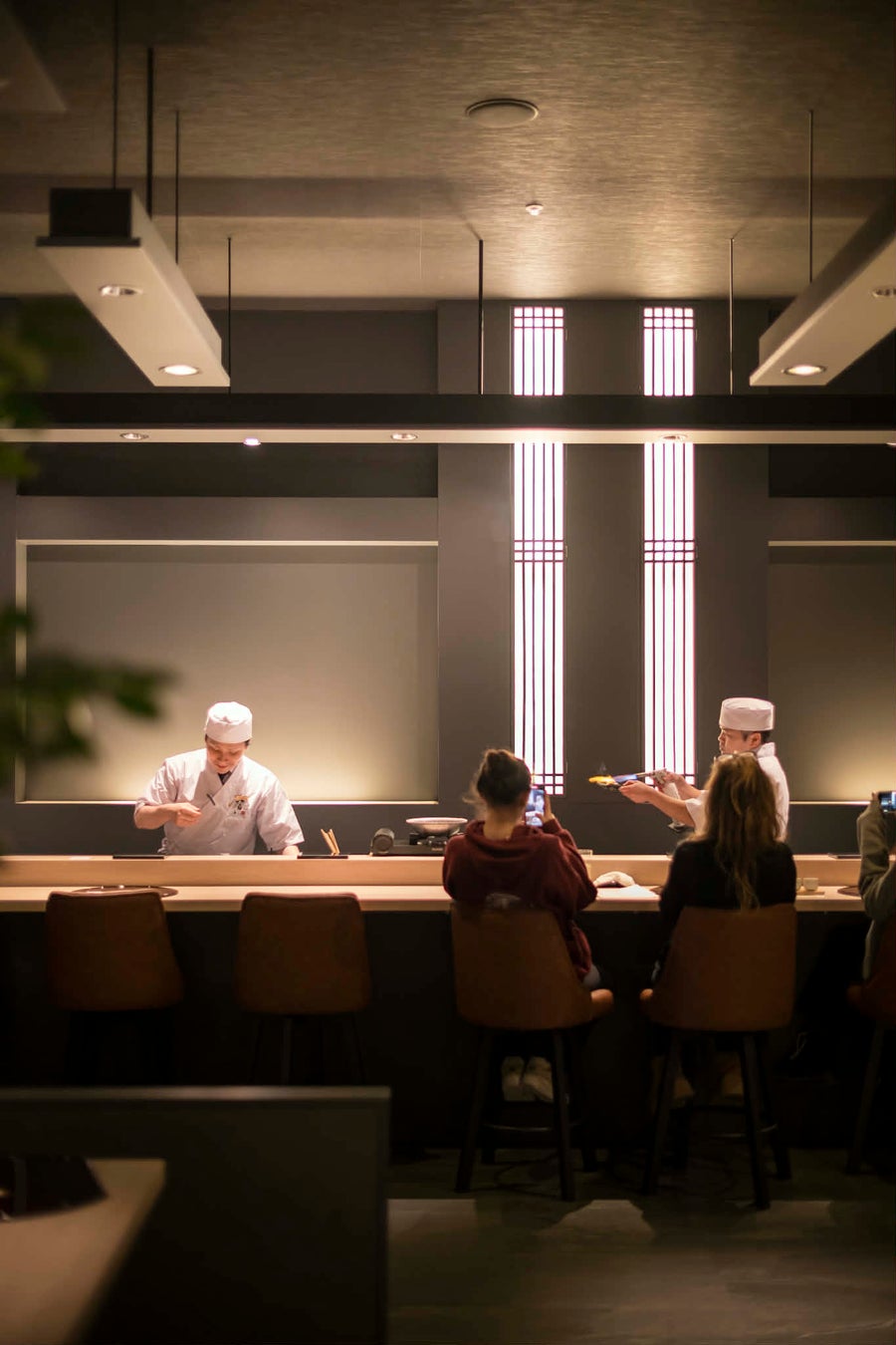 店内は、商業施設内の飲食店としては驚きの広々とした空間使いで、6階からの眺望も特徴的です。大きく取られた窓越しにL字のカウンターを配した贅沢な空間で、職人によるライブ感あふれるパフォーマンスも目の前でお楽しみいただけます。