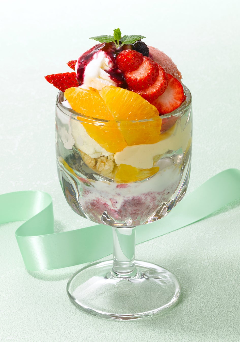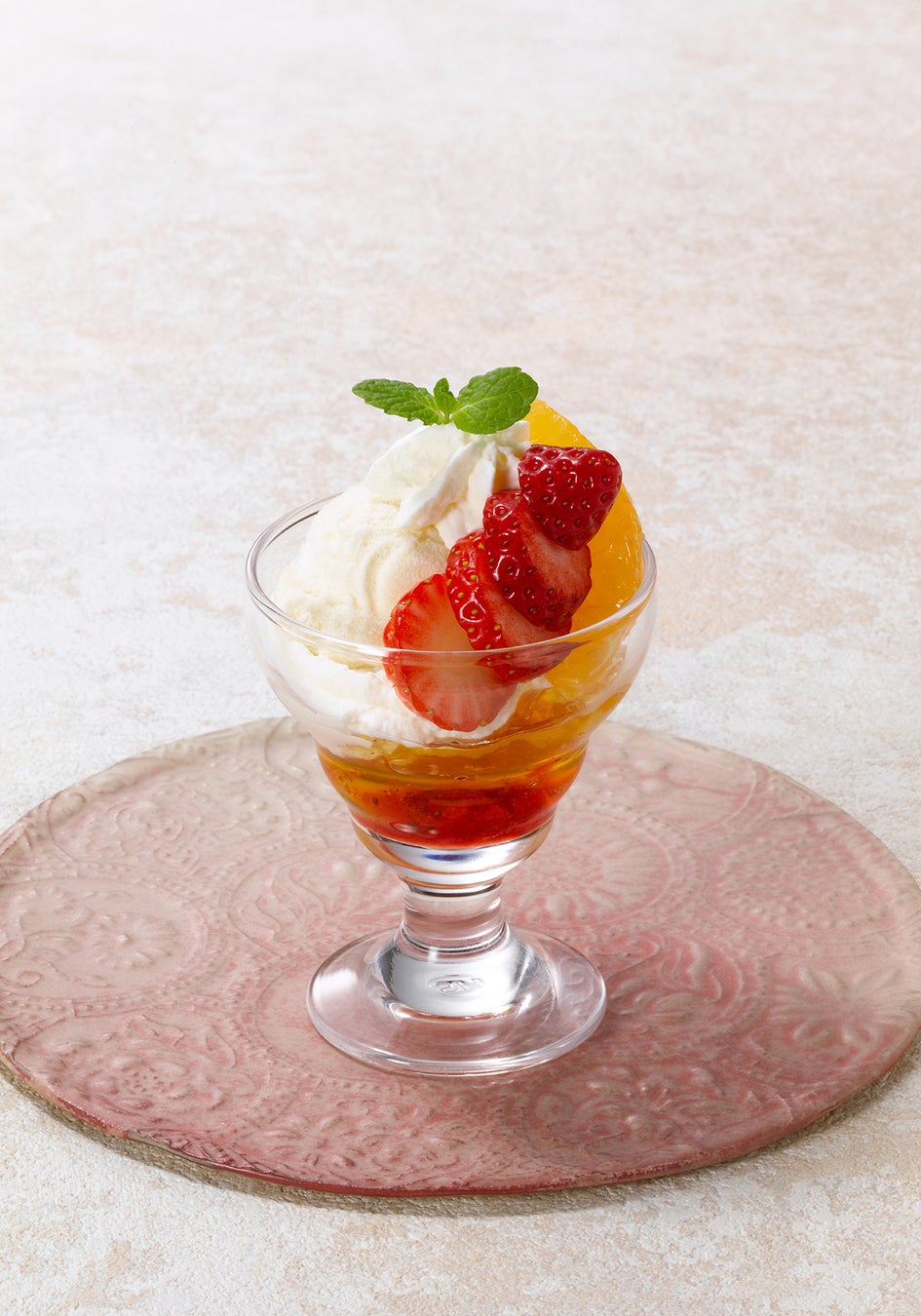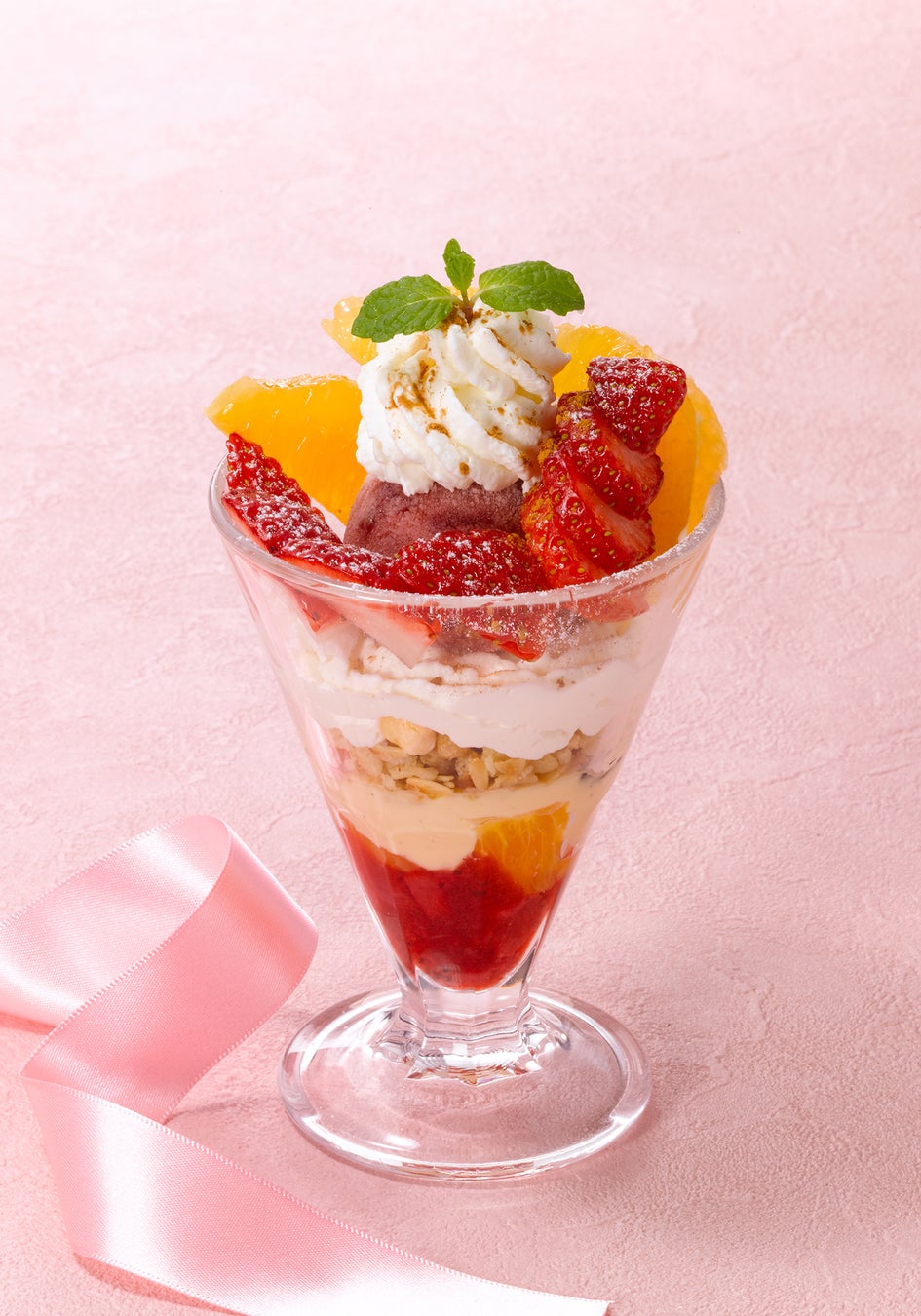 旬の甘ずっぱい苺と不知火にホイップクリーム、バニラアイスクリーム、爽やかなミント&レモングラス風味ゼリーなどを重ねたプチサイズのパフェです。