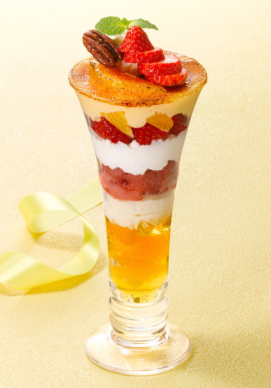 人気のブリュレパフェが、2ndシーズンでは春らしい装いで登場。カリッと香ばしくキャラメリゼした濃厚なクレームブリュレに旬の甘ずっぱい苺と不知火、ピーカンナッツ、塩キャラメルアイス、ホイップクリーム、ストロベリーソルベ、バニラアイスクリームを重ねました。最後の層を不知火とミント&レモングラス風味ゼリーにすることで、春らしい甘ずっぱさと爽やかさの余韻が残る一品です。