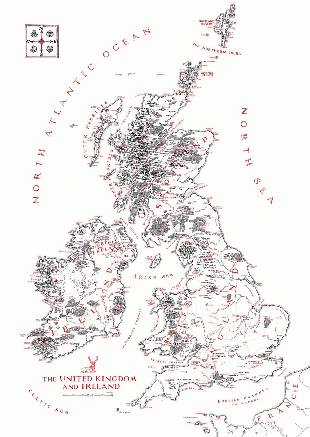トールキン風につけペンとインクで手描きした、イギリスとアイルランドの地図がついに完成しました。提案があればコメントして、次にどこを描くべきか教えてください。さあ、お茶を飲みながら足を上げましょう。 UK United Kingdom
