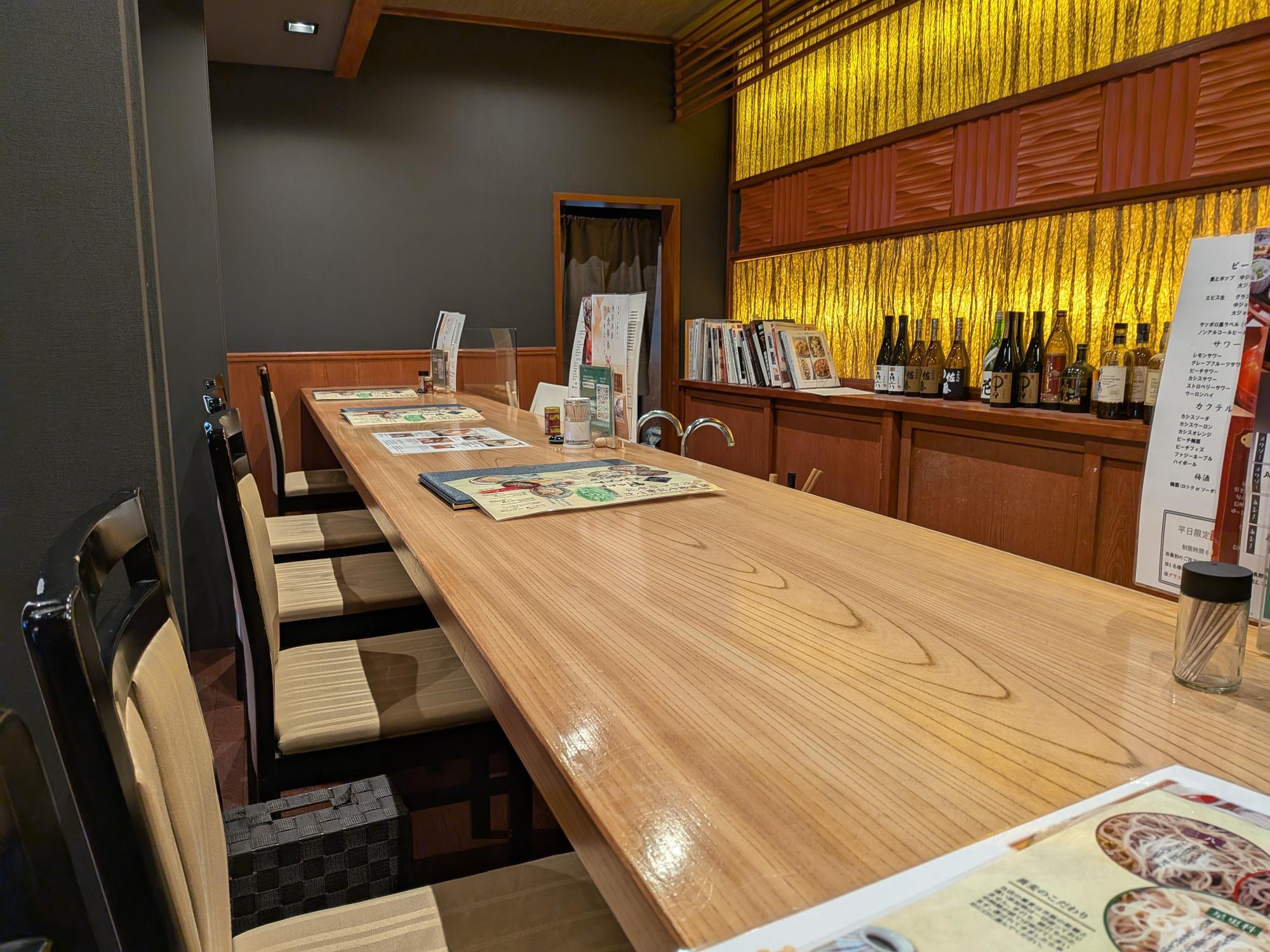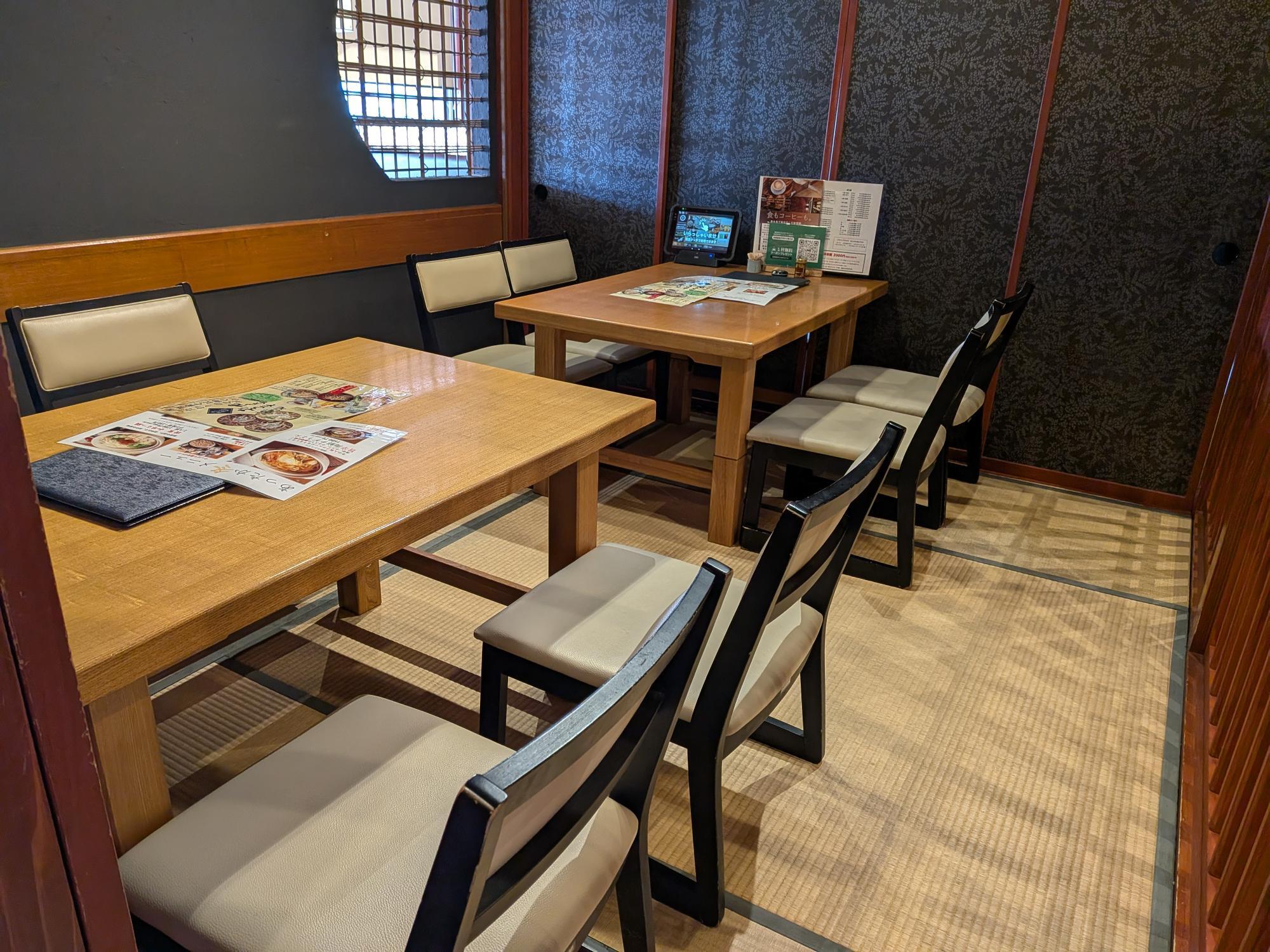 店内へ足を踏み入れると、和の静謐な空間が広がり、穏やかな時間が流れています。テーブル席はゆったりとした配置で、ご家族やご友人との食事に最適。また、座敷席も用意されており、リラックスした雰囲気の中で食事を楽しめます。利用人数や目的に合わせて席を使い分けられるのが魅力です。