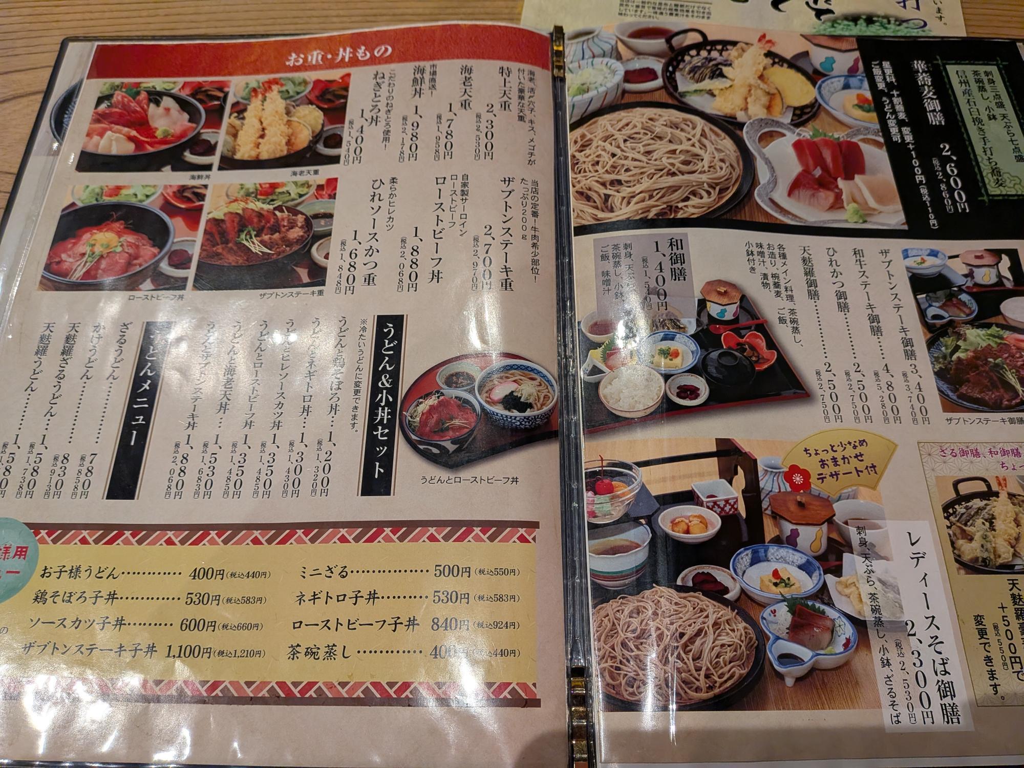そば以外にも、お造りや天ぷら付きの蕎麦御膳、新鮮な魚介を使ったカルパッチョ、さらに、ザブトンステーキ丼や地鶏の香味揚げ定食など、定食・丼ものが充実していました。