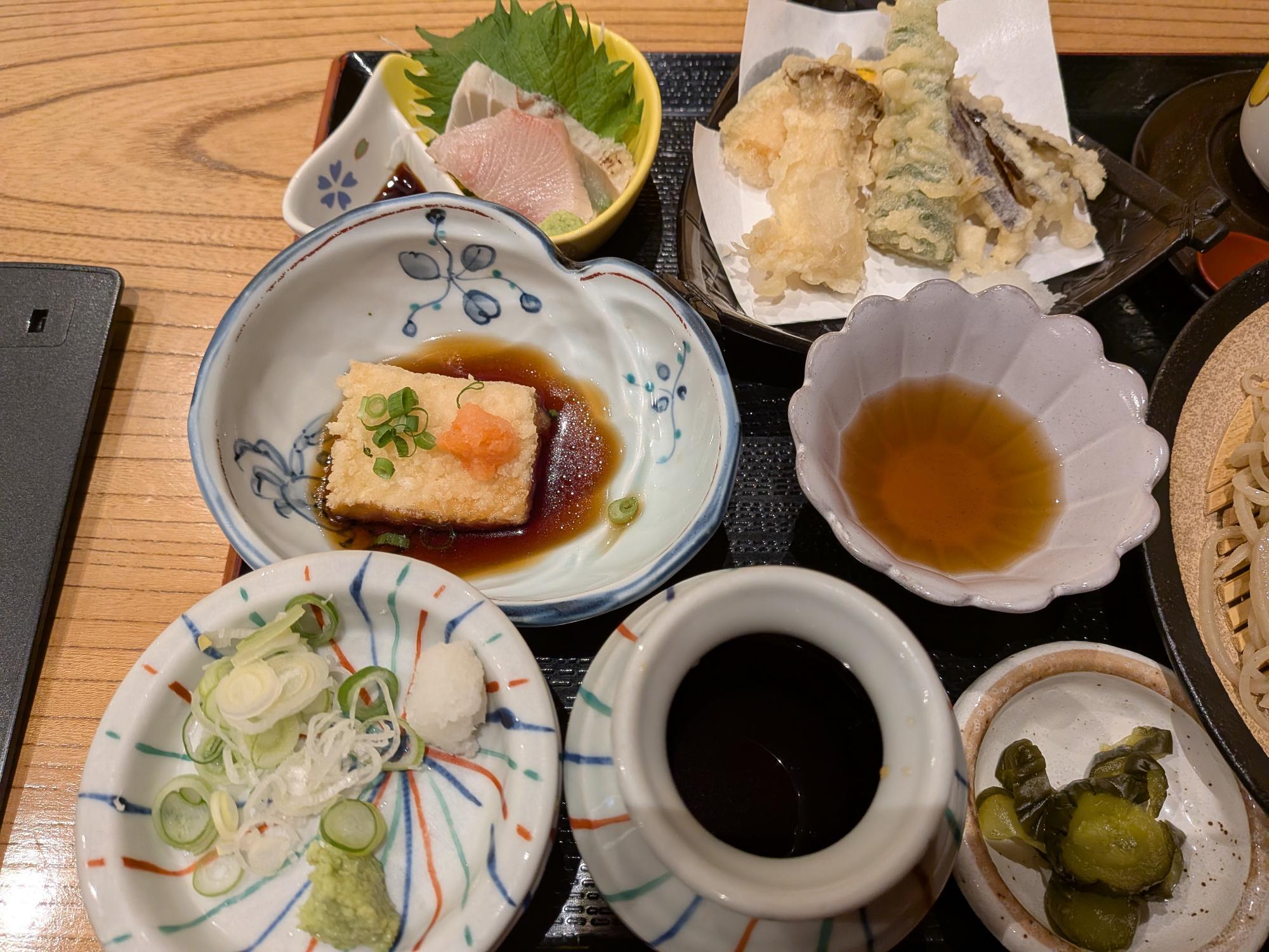自慢のざるそばに、小鉢、揚げたての天ぷら、茶碗蒸し、そしてお刺身まで付いた、まさに贅沢なセット内容です。