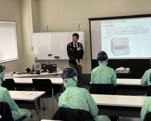 熊本県の県立高校教職員延べ14名が参加しました。本研修は、半導体業界や半導体の構造や種類などについての座学研修をはじめ、クリーンスーツを着用していただき、実際に現場でも使用されている半導体製造装置を用いて、部品交換やOリングの交換、真空設備の立ち上げなどのメンテナンス業務に関する実技研修を実施しました。