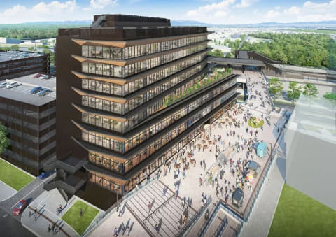 商業・オフィス・駐車場で構成される、11階建ての複合施設。計画地は、28年夏に開業予定のJR千歳線の新駅「(仮称)北海道ボールパーク駅」と球場を結ぶペデストリアンデッキの中間に位置し、デッキから直接アクセス可能。