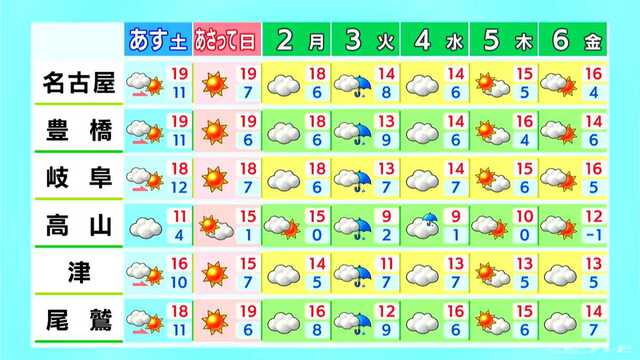 最高気温は名古屋や岐阜で18℃、豊橋や高山、尾鷲で17℃、津で15℃の予想です。日差しは届かなくても、季節先取りの暖かさになる所が多いでしょう。