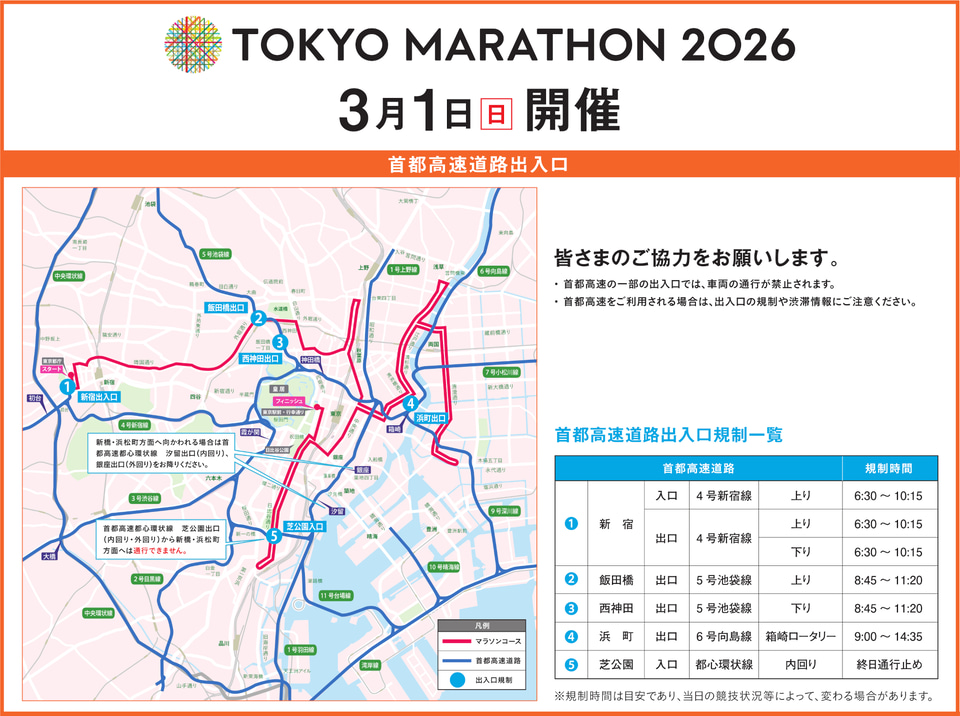 首都高では、一部の出入口が車両通行禁止に。スタート地点に近い4号新宿線の新宿出入口(上り)・新宿出口(下り)は6時30分ごろから通行止めとなるほか、5号池袋線の飯田橋出口(上り)・西神田出口(下り)、6号向島線の浜町出口(箱崎ロータリー)などで規制を実施する。