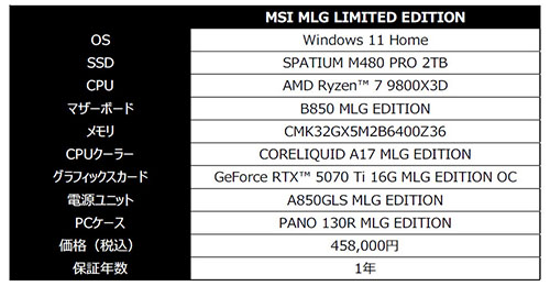 マザーボード(B850 MLG EDITION)、グラフィックスカード(GeForce RTX 5070 Ti 16G MLG EDITION OC)、水冷クーラー(CORELIQUID A17 MLG EDITION)、電源ユニット(A850GLS MLG EDITION)、PCケース(PANO 130R MLG EDITION)が限定のLoong:NIAデザインモデル。