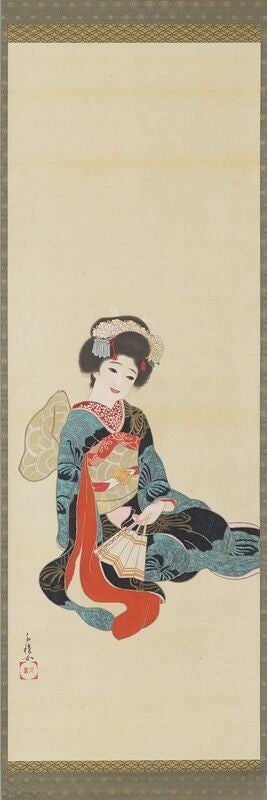 木谷千種 舞姫図/箱書に「曽根崎艶話舞姫」と記され、大正5年(1916)刊行の小林一三『曽根崎艶話』に掲載された図版の原画と知られる作品。本図は、鮮やかな緋の長襦袢、白茶地に銀襴大模様の帯、紫陽花の花櫛に赤紐の前髪括りなどと細やかに表される「襟替え」の舞妓「豆千代」を描いている