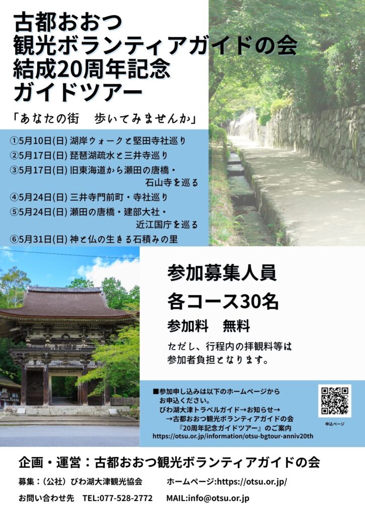 大津市の名所・旧跡を訪れる市民や観光客に、大津の歴史や自然風土・物産などを会員が観光案内する 古都おおつ観光ボランティアガイドの会 が20周年を記念して『20周年記念ガイドツアー』を開催します。